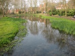 Two weirs were removed and the site allowed to drain. A temporary dam was built at the top of the site and river flow was piped around the working area. Working from the upstream end, a new channel was dug through the accumulated silt following the line of preferential flow. Nicospan was installed to provide support to the new channel sides and to ensure separation of the silt from the gravel infill, which was imported to form the new river bed. It was important to allow at least 500mm of gravel to provide the depth that chalkstream invertebrates require for their life stage. Excavated silt was distributed around the site within the boundary of old ponds. The new channel was tied into the original course of the river which flowed around the back of the island in the lower pond. A low-lying bund was installed in place of the weir to create a wetland feature. Following completion of the river restoration work, new paths were laid in the gardens and an interpretation board installed.