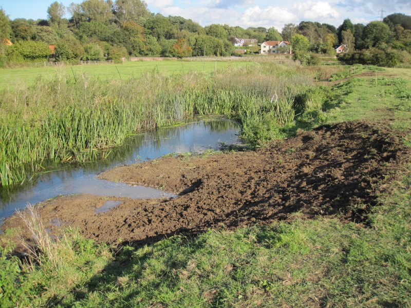 Berm feature incorporating a 'scrape' feature intended to be a refuge for fish fry or to enable the growth of water-loving macrophytes.