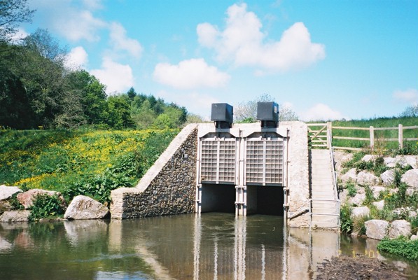 View look upstream towards outlet of flood storage reservoir, with flow control structure. Courtesy of the River Restoration Centre.